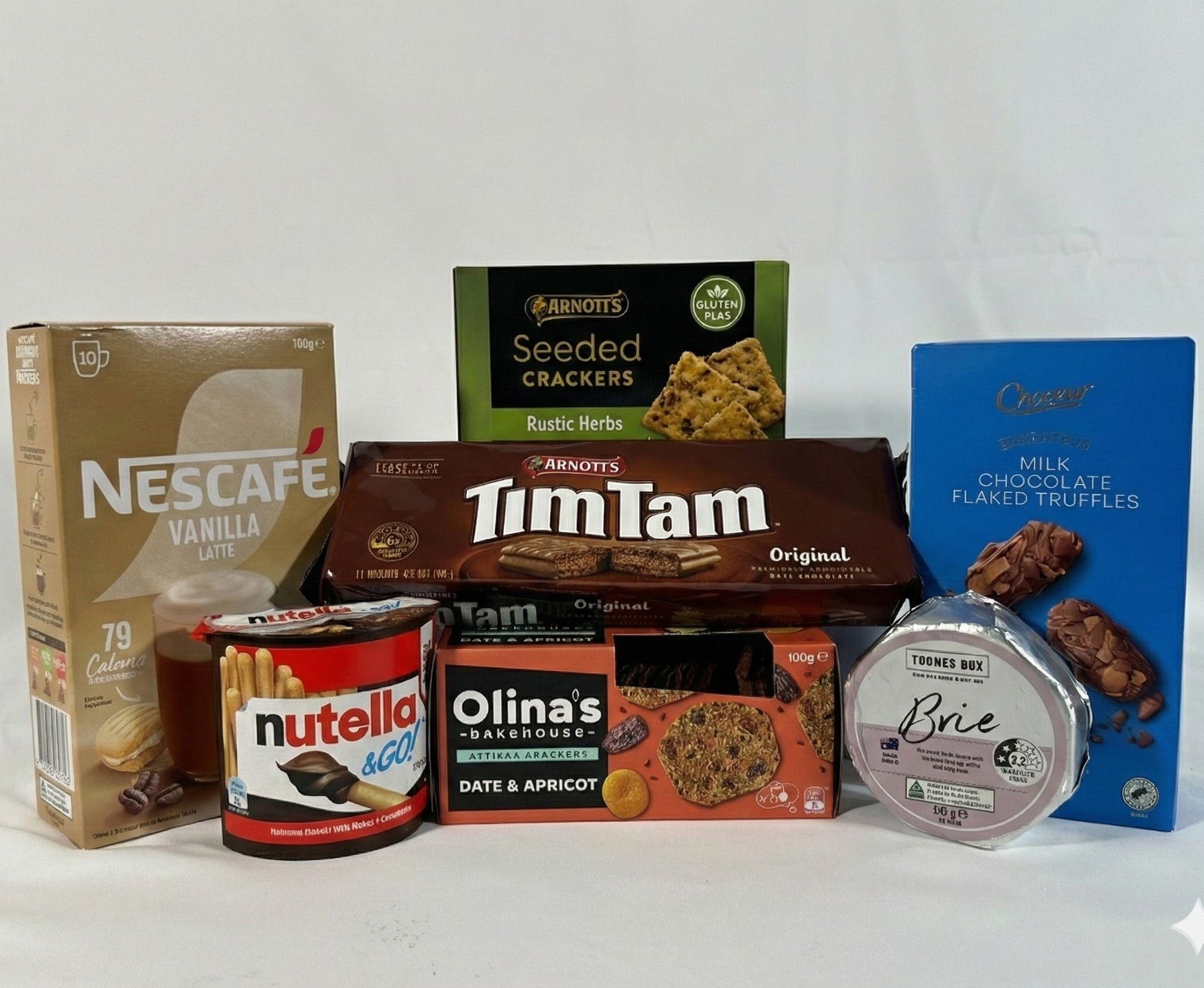 Get the best of both worlds in one convenient bundle. This pack includes everything you need for a delicious snack session. Enjoy a creamy brie cheese with assorted gourmet crackers for a savory fix. Then, indulge in sweet favourites including chocolate biscuits, milk chocolate truffles, and a hazelnut spread dip. A pack of instant vanilla latte mix is included to wash it all down.