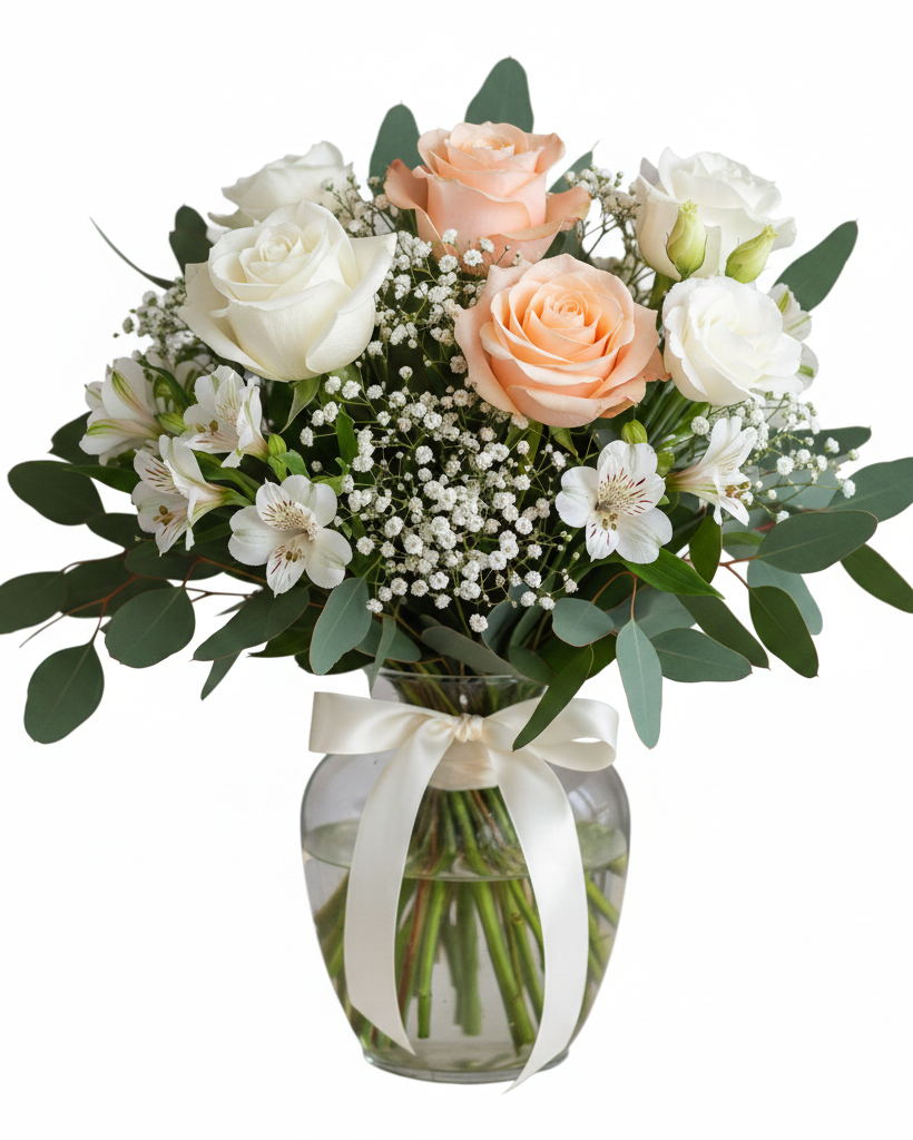 This captivating bouquet blends delicate beauty with serene charm. It features 2 pristine white roses and 2 soft peach roses, beautifully complemented by 2 alstroemeria, airy white baby's breath, and lush eucalyptus foliage. A single elegant 1 lisianthus adds a touch of refined grace,
